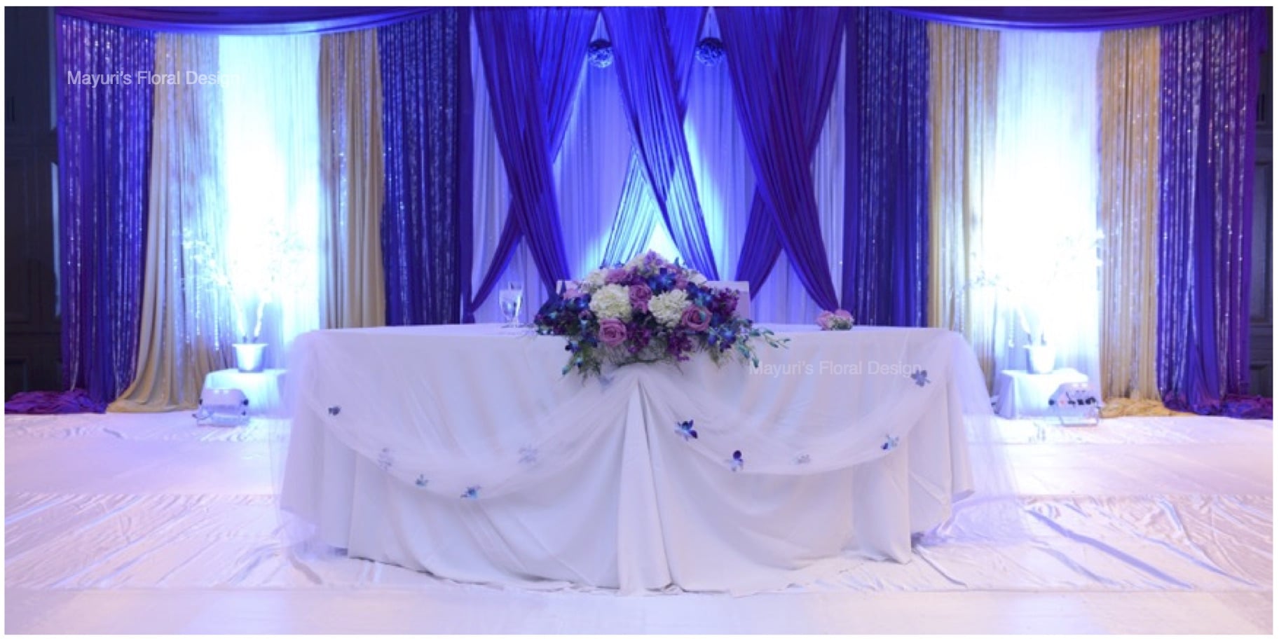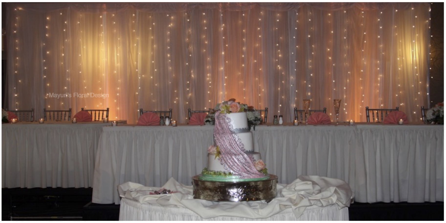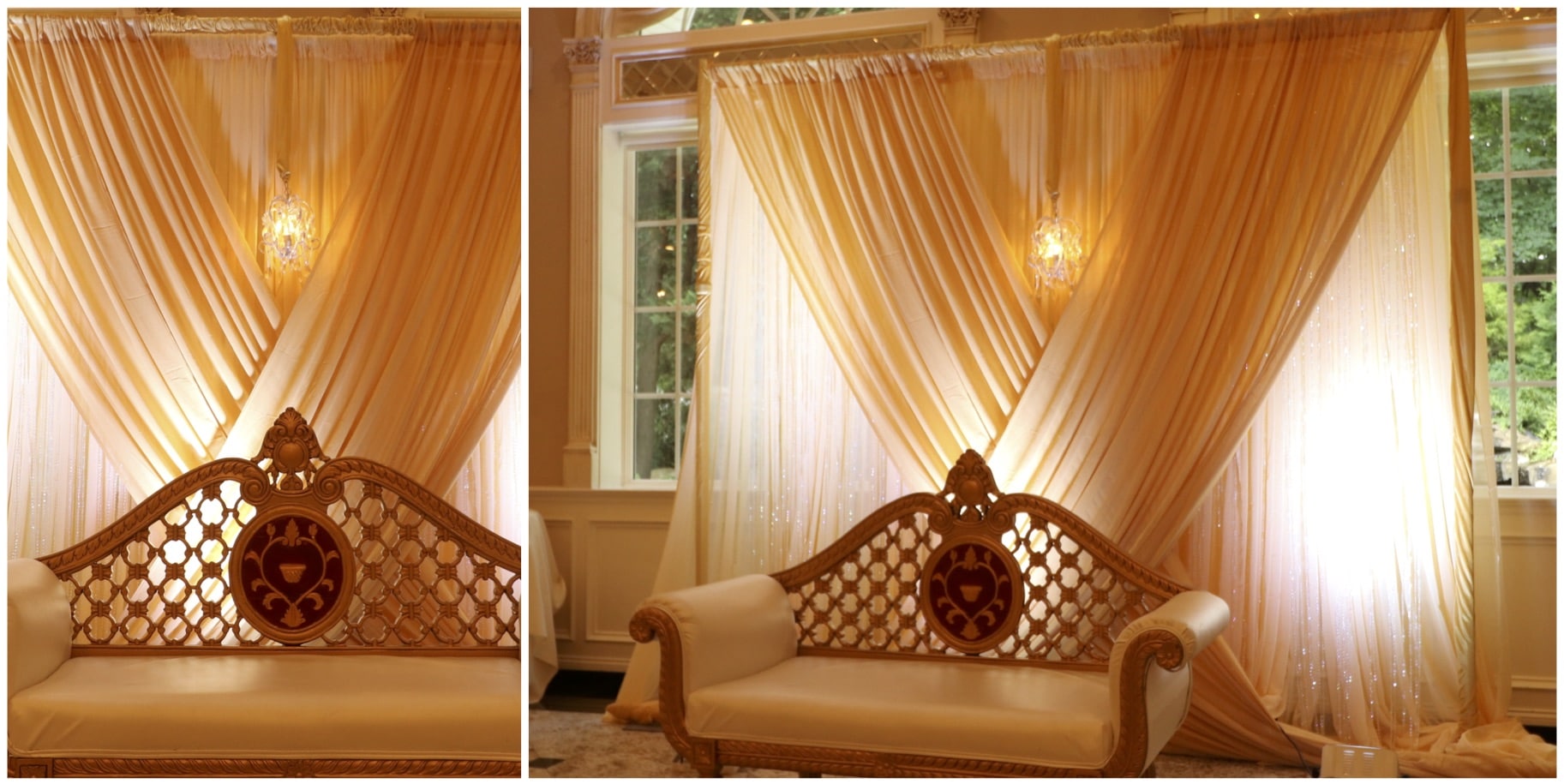 Enhance the beauty of any space with decadent draping to create an eye catching focal point for your ceremony or reception. Our draping designs transform any venue into a breathtaking setting with an enchanting backdrop that can feature lovely crystal accents and dramatic lighting effects.